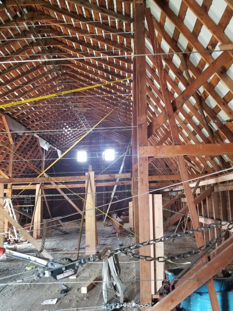 The roof sag was noticeably and considerably reduced via permanent tension rigging as rafter ties. 140 hurricane ties and diagonal rigging across the rafters installed to prevent raking and drooping, column framing and rafter support, as well as a new foundation was added.