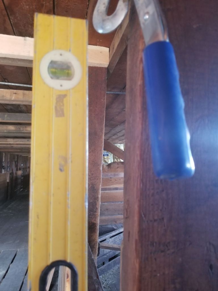 Picture Above: This is a 70×30, two-story balloon framed, gambrel style barn built in the early 20th Century. It had 18″ of roof spread on 16ft studs, a foundation on the West side only, which had been installed during the 80’s (unfortunately the foundation was not attached to the floor joists and the wall was not leveled before install so complete straightening was impractical, there was max of 8 degrees of lean on eastern exterior load bearing walls with an average of 4 and an average of 3 degrees on the western wall, it was clear that most the barn was drifting and leaning to the East while the foundation held the lower Western exterior wall in place. Finally there was an apparent massive 18″ sag in the roof across the ridge due to the bottom floor joists sinking and rotting compounded by the roof spread being greatest in the mid section.